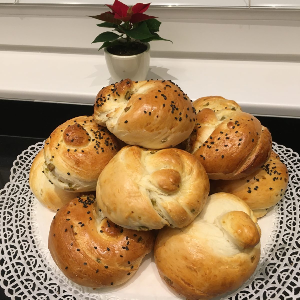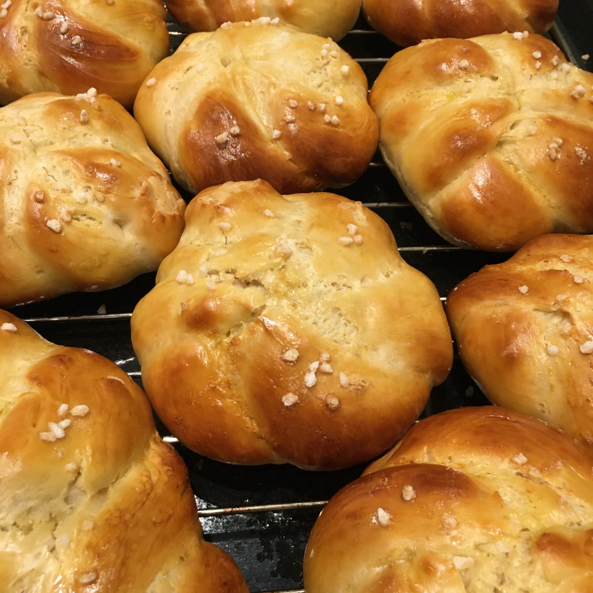 - 2 Challahs (weiche Hefebrote) in verschiedenen Flechtformen (länglich und rund)